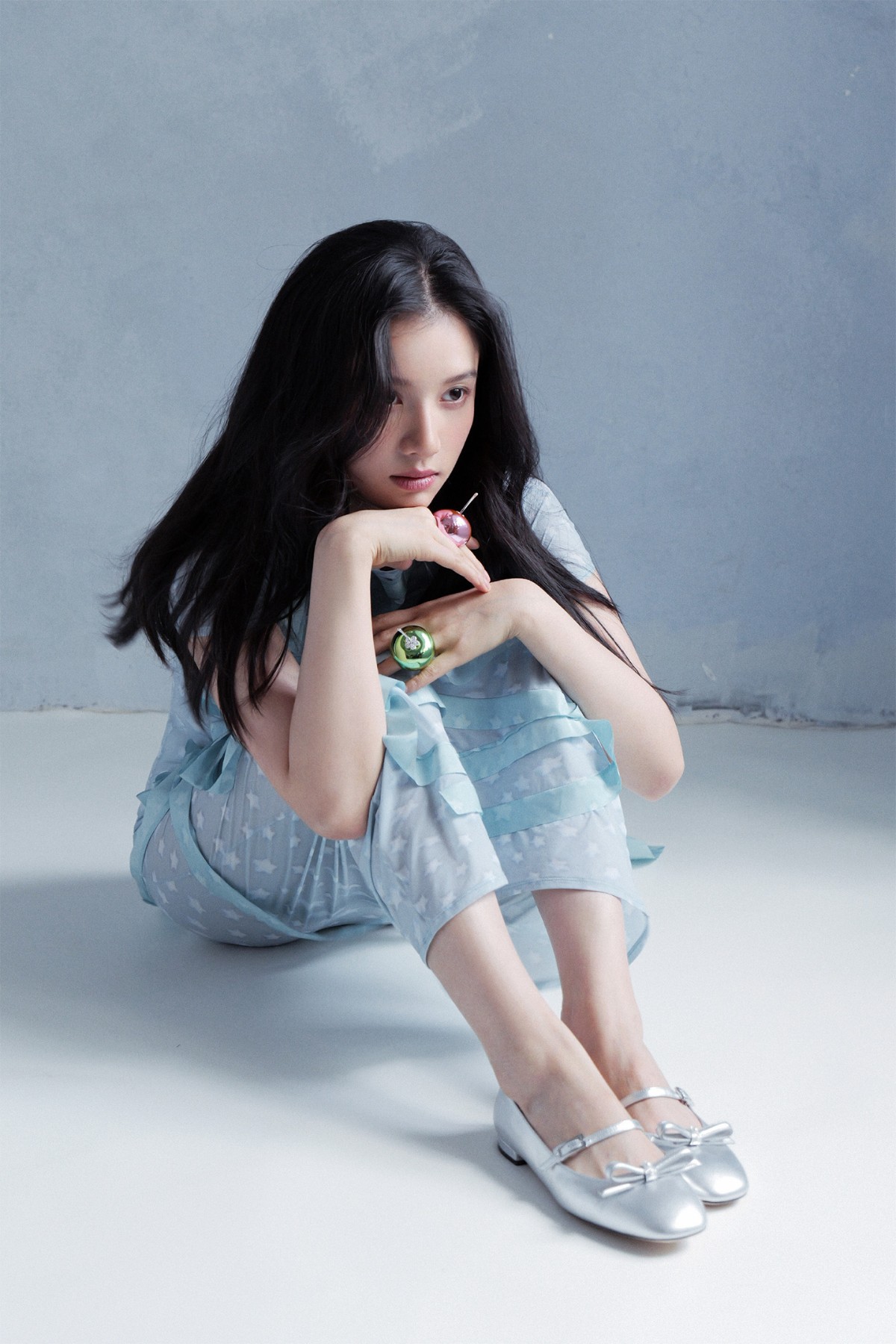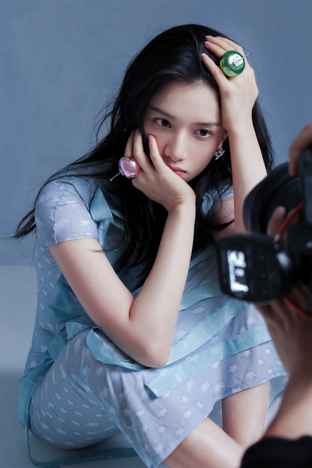 从造型细节来看,这组大片的搭配巧思让整体风格更具记忆点。蓝色褶皱长裙的选择十分贴合张婧仪的气质,褶皱面料增加了裙装的层次感与垂坠感,避免了单一色彩的沉闷;星星图案的点缀则为造型注入了一丝灵动,不会让整体过于严肃。而蓬松卷发与裸色唇妆的搭配,既中和了长裙的正式感,又突出了她的面部优势——清冷的骨相在柔和的卷发衬托下更显立体,裸色唇妆则让英气中多了几分温婉,两种风格碰撞出独特的魅力。